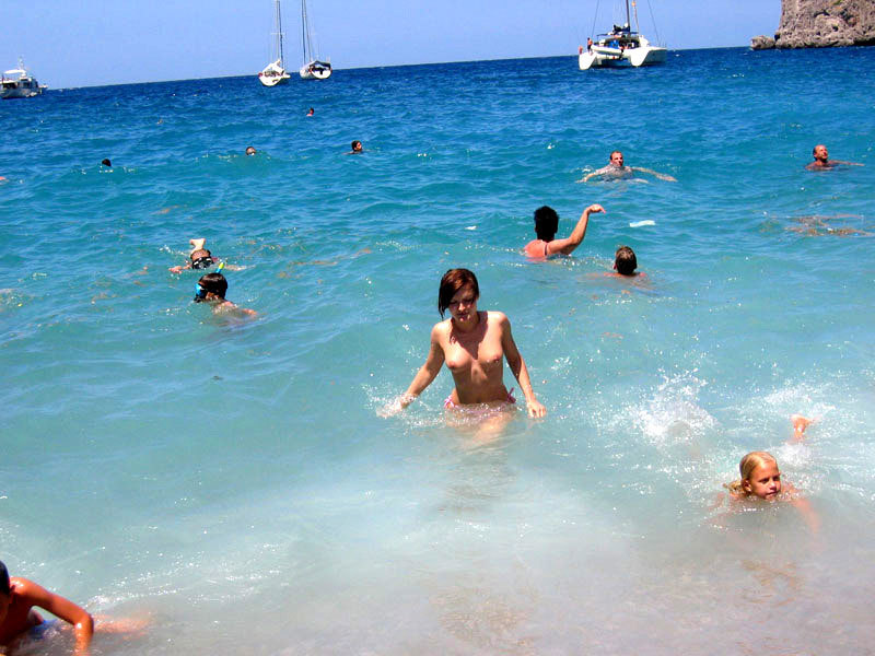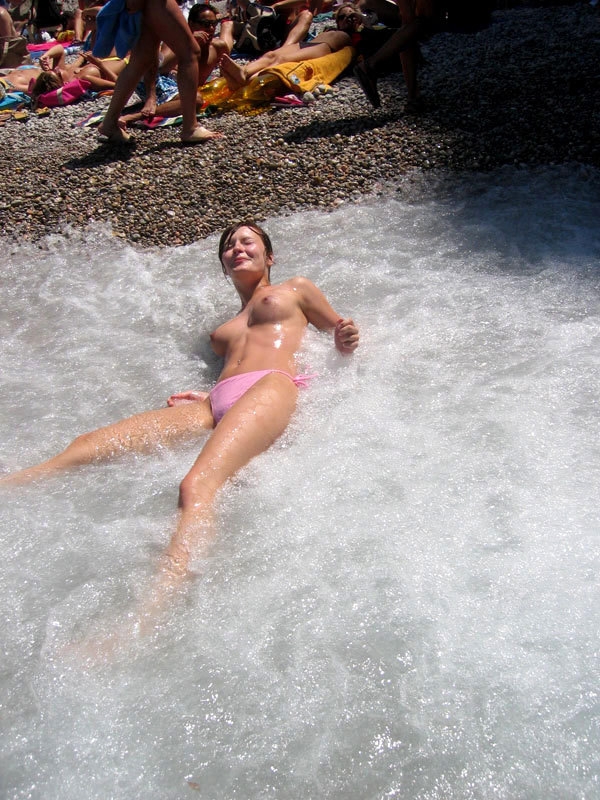 Порно фото похожее на Славянка на курорте загорает топлес и купается голышом на пляже:
