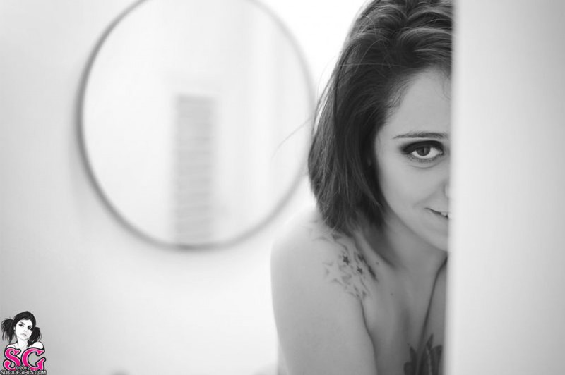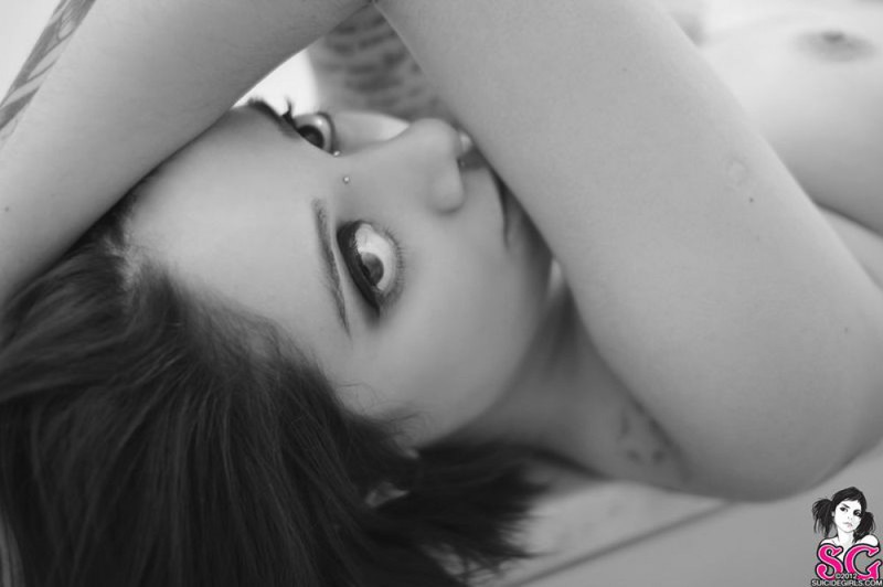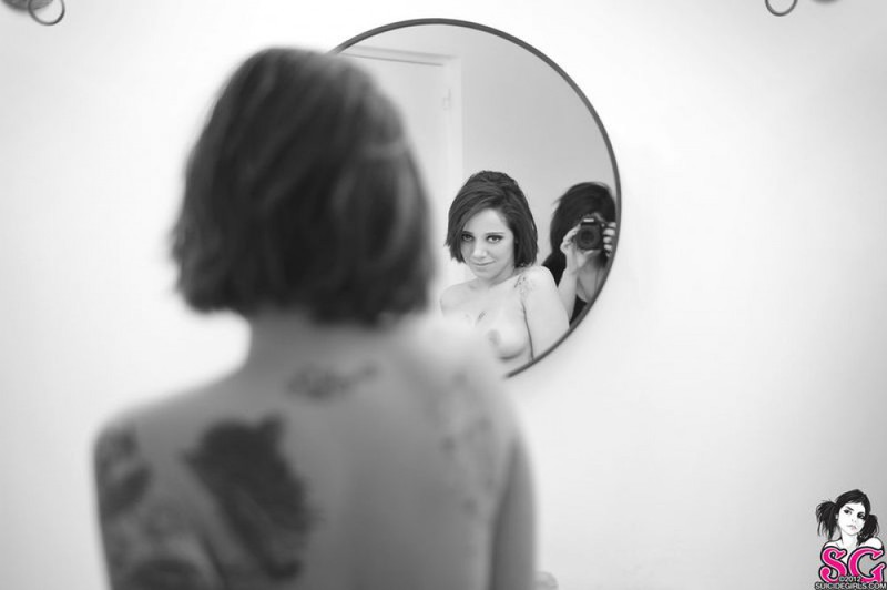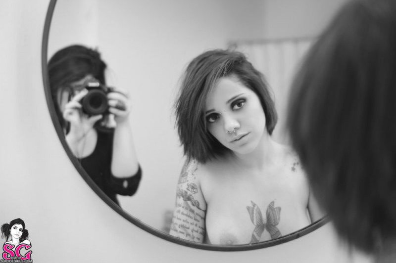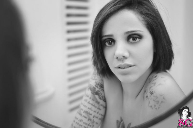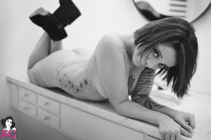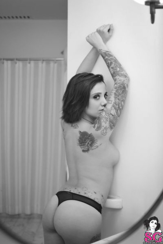 Порно фото похожее на Черно-белые снимки татуированной неформалки с пирсингом в ванной: