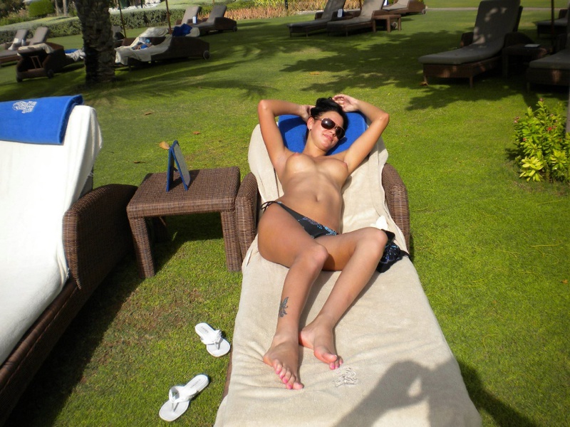 Порно фото похожее на Молодой человек фотографирует девушку топлес во дворе отеля: