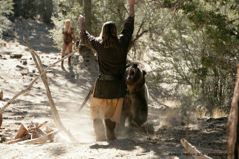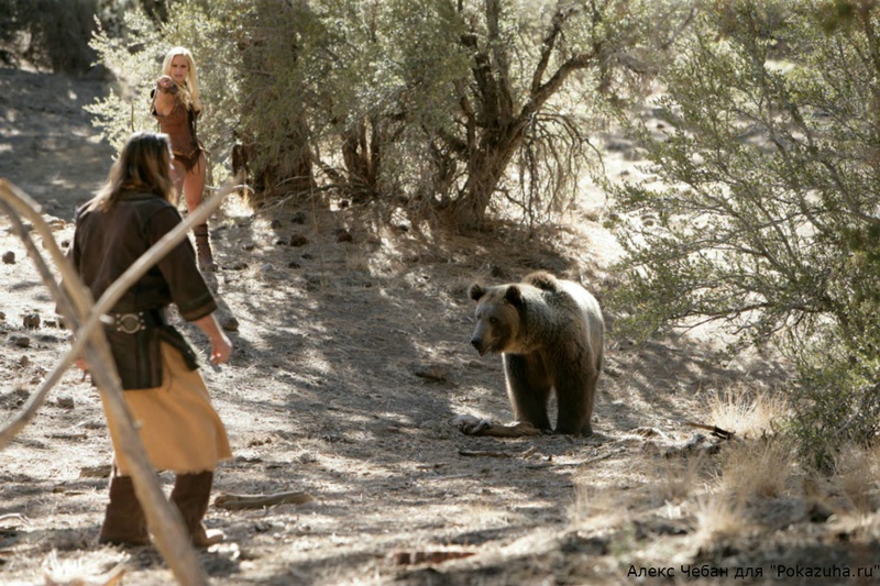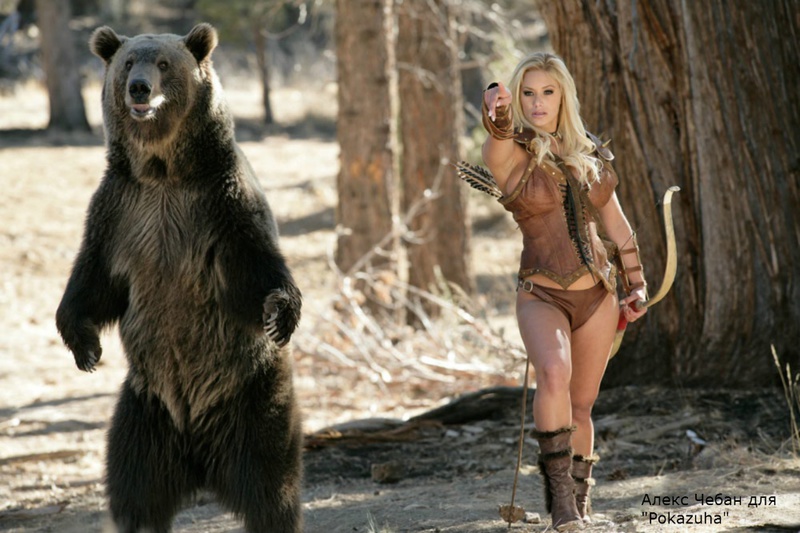 Эротика от сексуальной грудастой блондинки с медведем в дикой природе