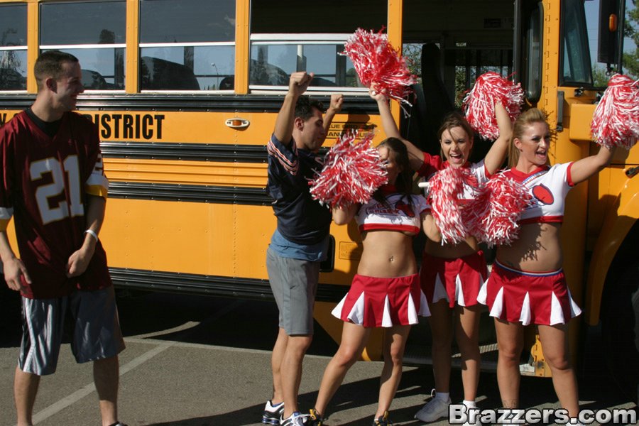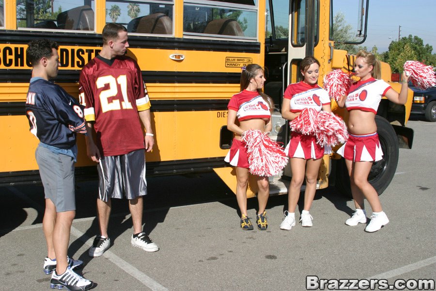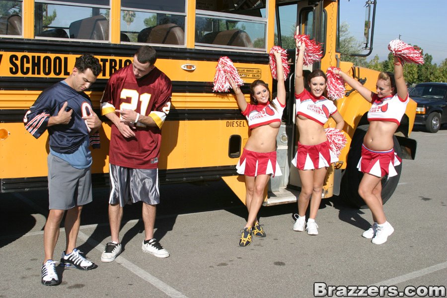 Порно фото похожее на Три грудастых чирлидера, устроили оргию в автобусе: