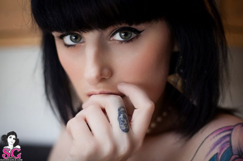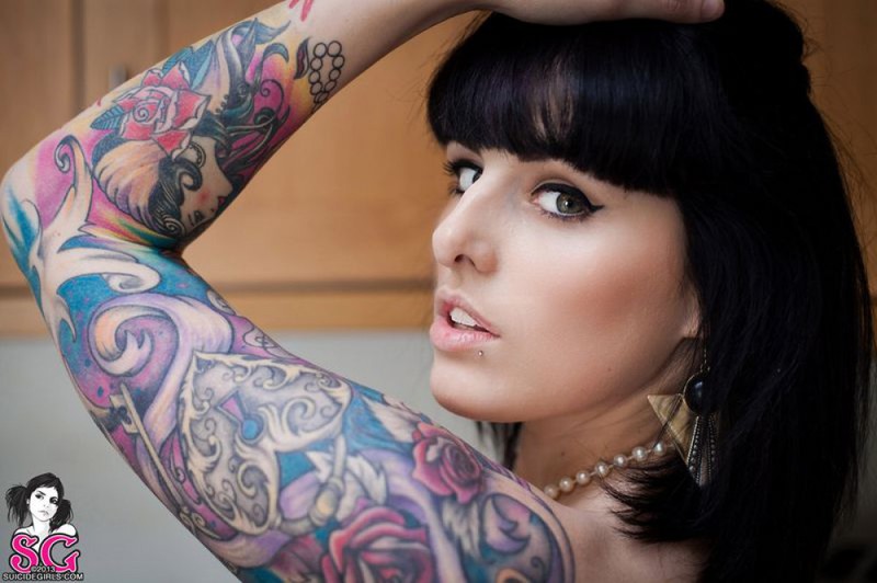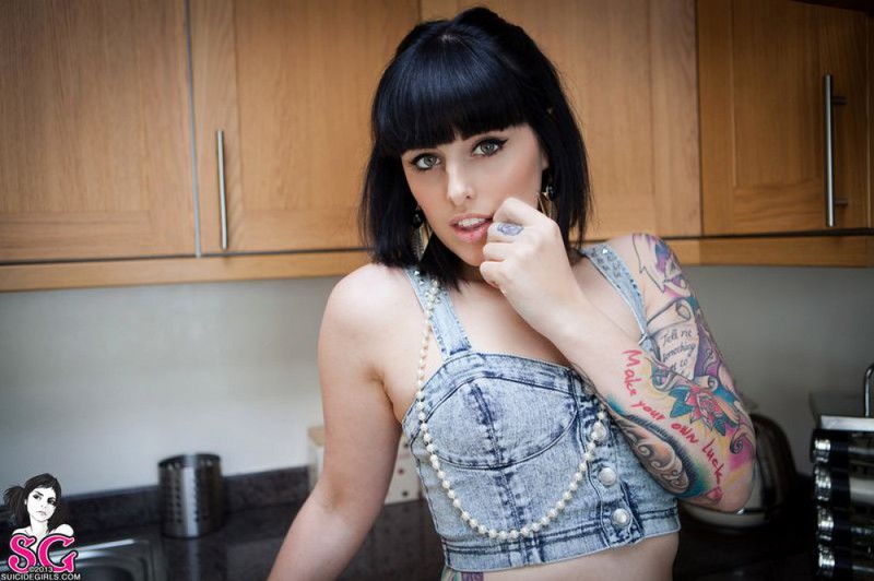 Порно фото похожее на Татуированная молодая неформалка в чулках позирует голая на кухне: