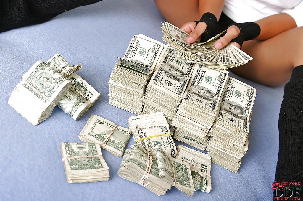Гламурная красотка в солнечный очках показывает писю в баксах