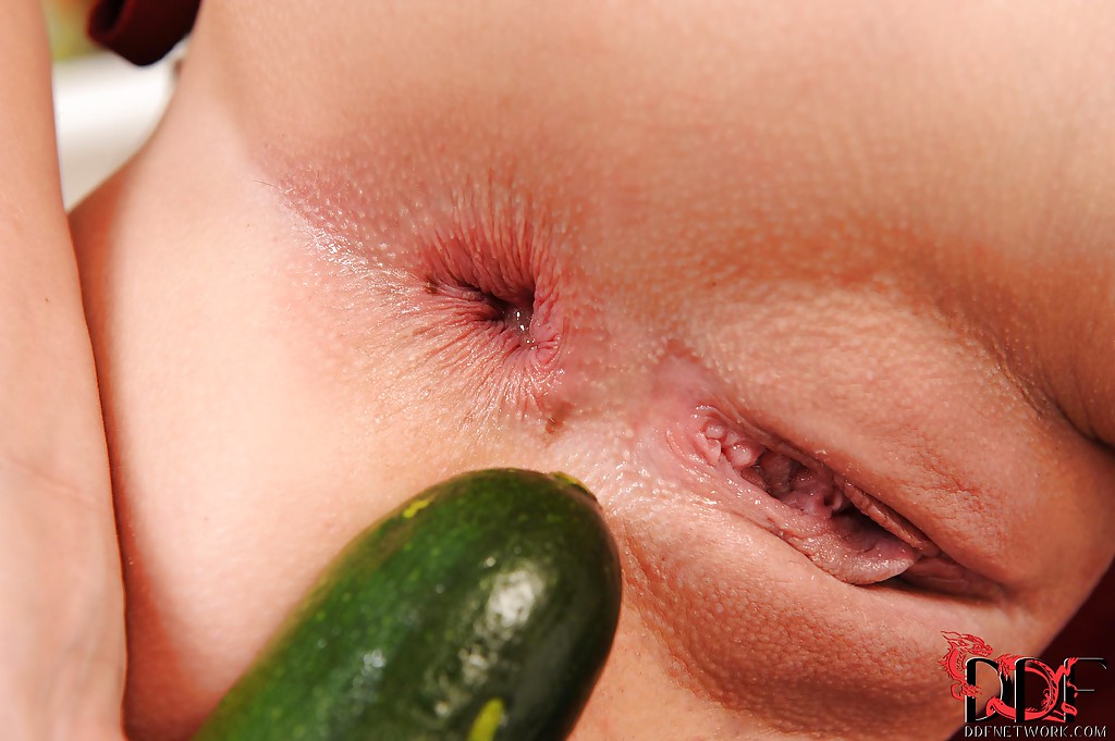 Порно фото похожее на Рыжая девушка в розовых кедах сняла фартук и суёт кабачки в анал: