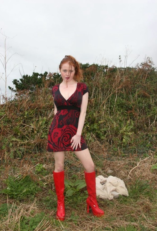 Порно фото похожее на Рыжая баба в сапогах позирует обнаженная на природе и в авто: