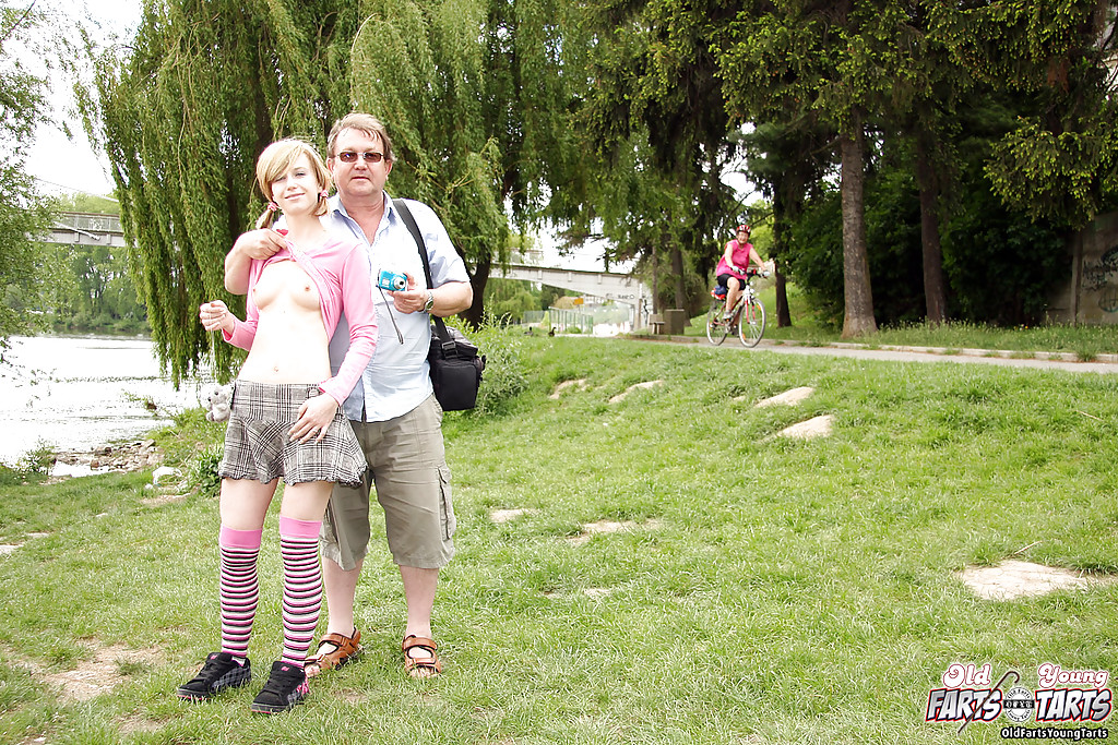 Порно фото похожее на Пузатый мужик трахает восемнадцатилетку в чулках возле железной дороги: