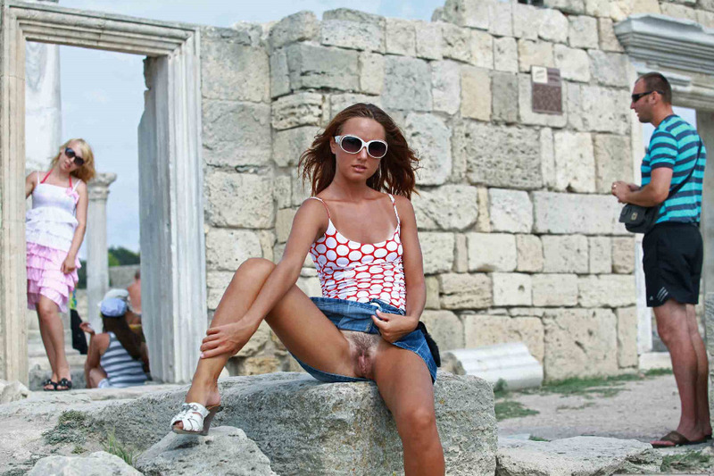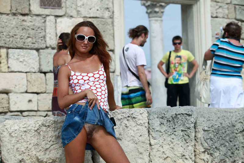 Порно фото похожее на Загорелая туристка без трусиков под юбкой на экскурсии: