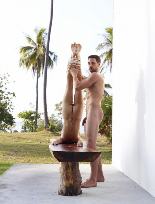 Порно фото похожее на Качок помогает голой жене-гимнастке тренироваться на лавке в саду: