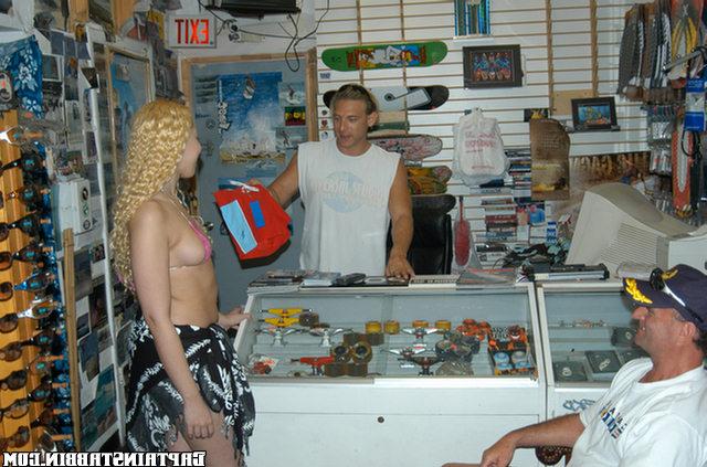 Порно фото похожее на Мулатка трахается с продавцами в магазине: