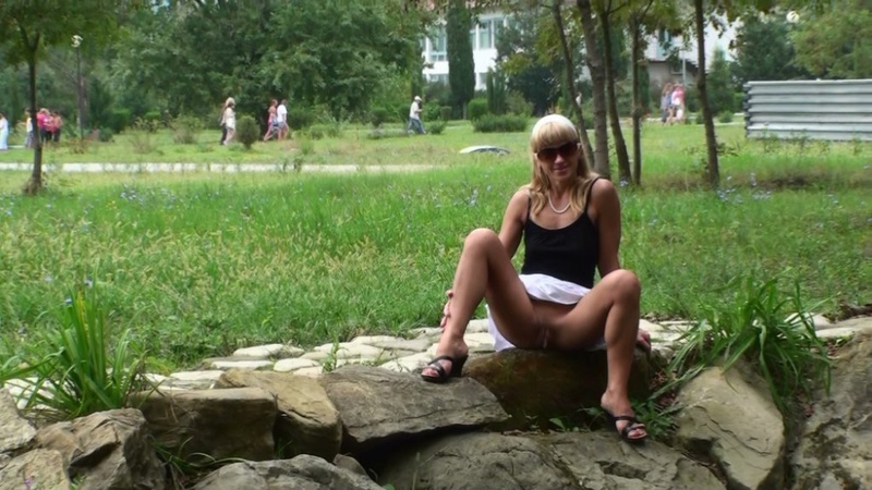 Русская блондинка светит киской и попкой в городе и на отдыхе
