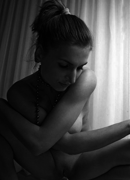 Откровенные черно-белые снимки девушки с большой грудью и бусами на шее