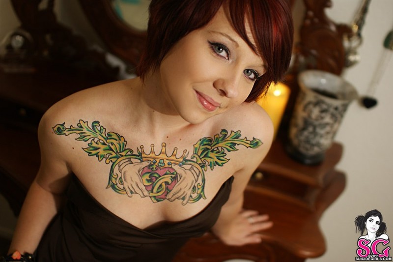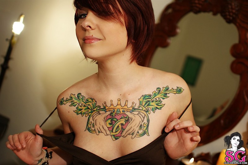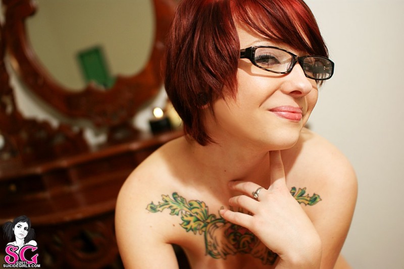 Рыжеволосая бестия в очках показывает татуированное тело