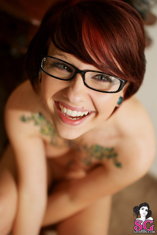 Порно фото похожее на Рыжеволосая бестия в очках показывает татуированное тело: