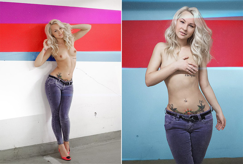 Порно фото похожее на Татуированная блондинка в джинсах и с голой грудью стоит у стены:
