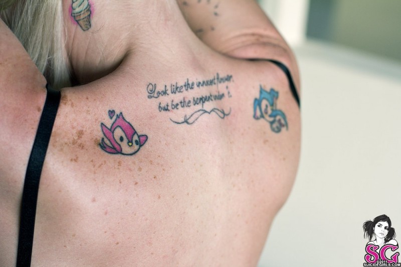 Порно фото похожее на Татуированная кокетка с маленькими сисями позирует голой: