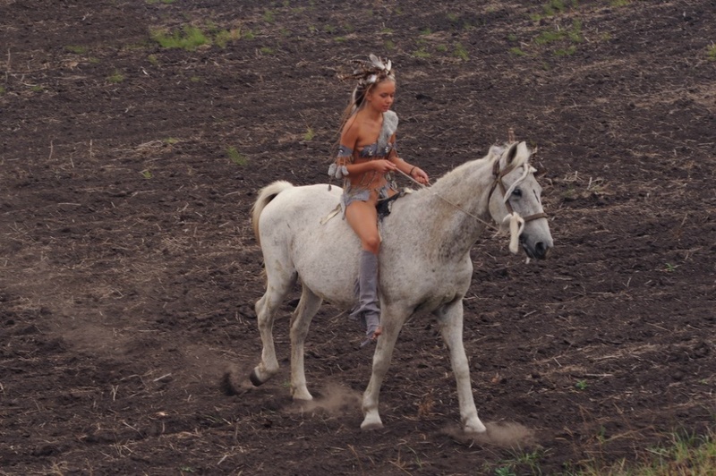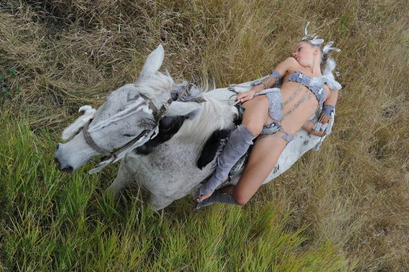 Порно фото похожее на Эротическое соло наездницы в поле со скакуном: