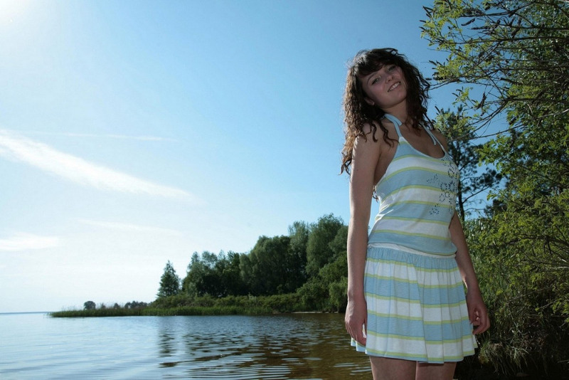 Худая девка позирует на берегу речки