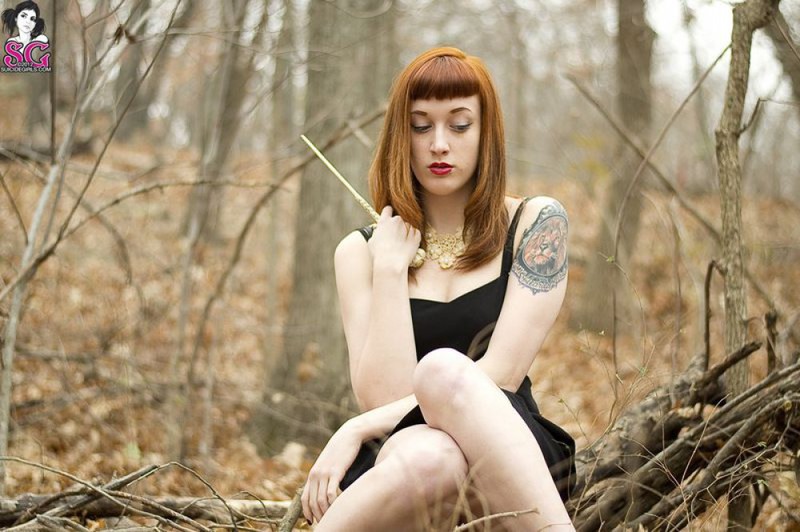 Порно фото похожее на Рыжая баба с татуировками в образе ведьмы сняла платье в лесу: