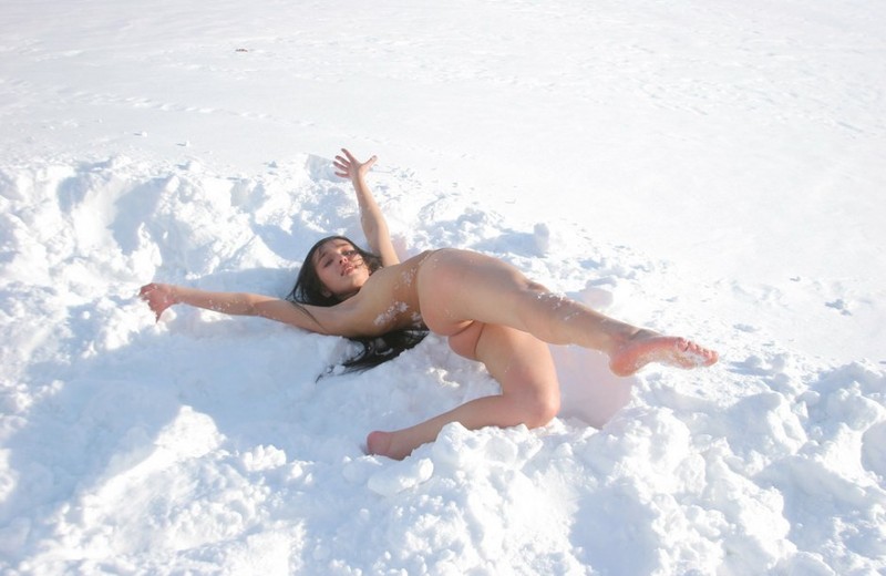 Порно фото похожее на Голая брюнетка позирует в сорокаградусный мороз на зимнем снегу: