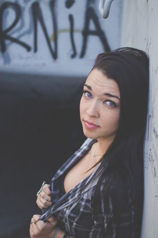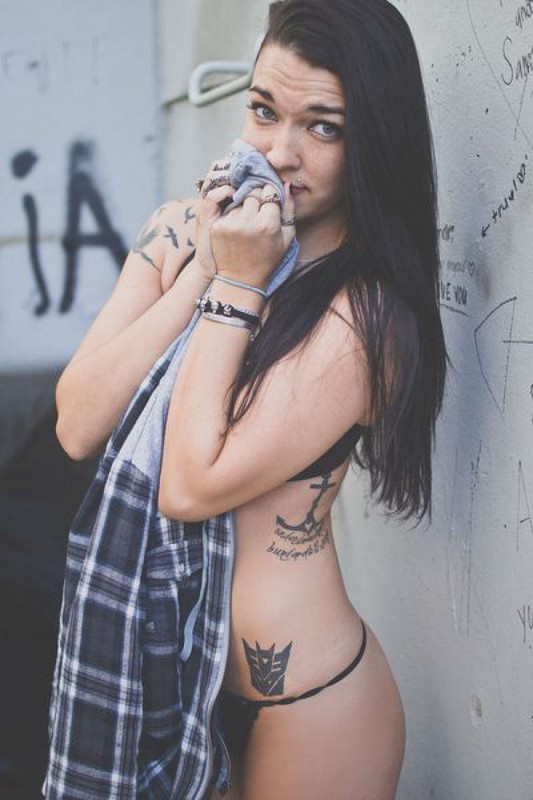 Татуированная неформалка разделась возле бетонной стены