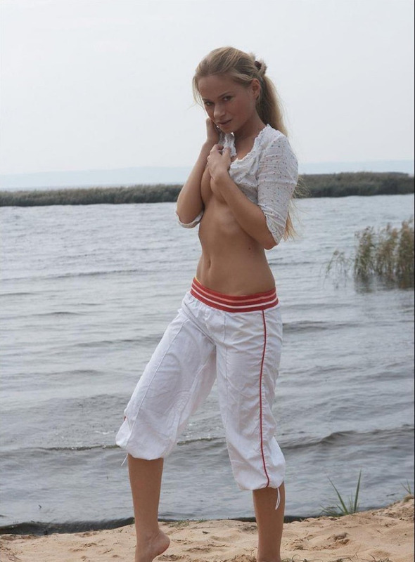 Порно фото похожее на Парень снимает стриптиз сексуальной цыпочки на берегу реки: