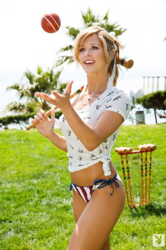 Модель с розовым полотенцем разделась и играет в крокет